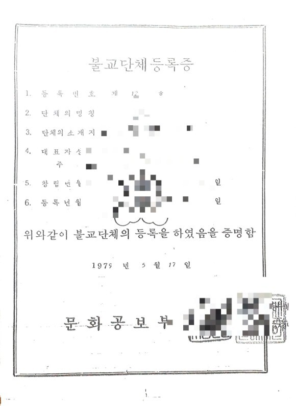 아래의 예시에서 볼 수 있듯이 아래 불교단체는 오래전 문공부 장관으로부터 받은 불교단체등록증이 있음을 확인할 수 있습니다. 이 서류를 함께 제출하시면 됩니다.